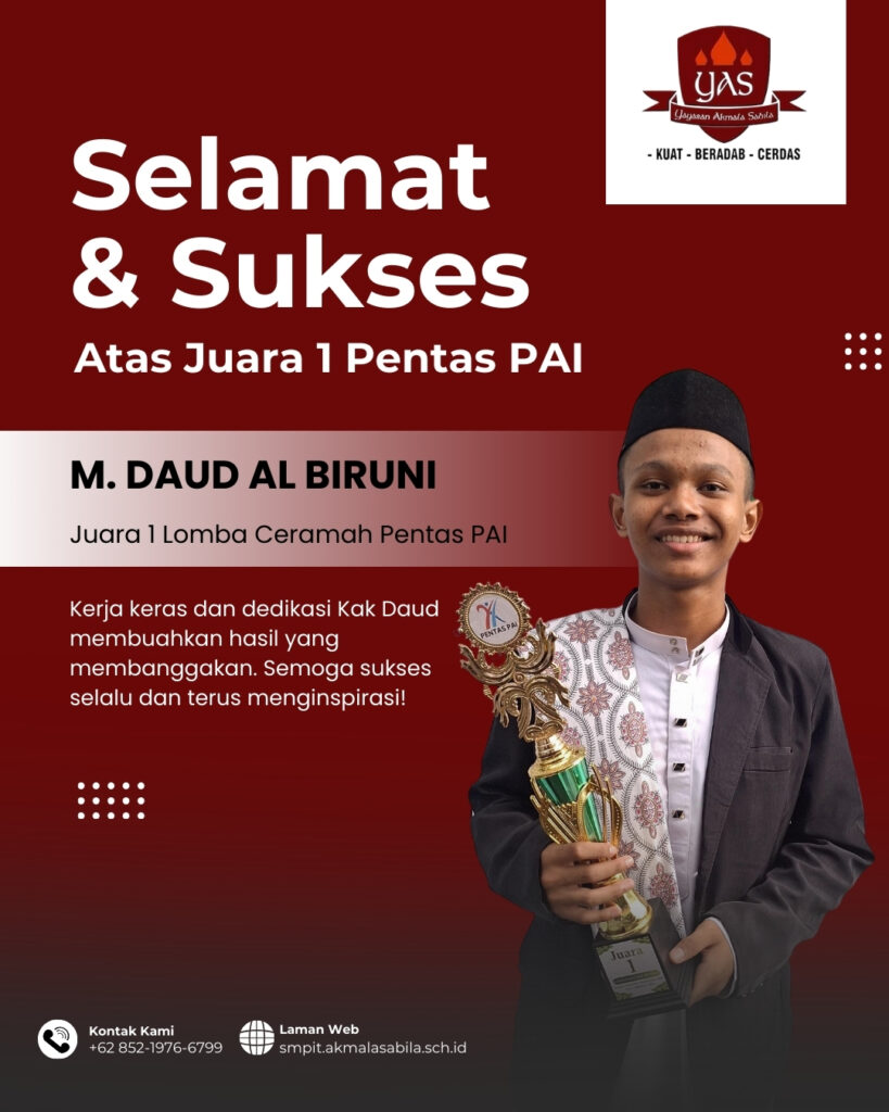 Alhamdulillah, kabar gembira datang dari SMPIT Akmala Sabila! Salah satu santri kita berhasil meraih Juara 1 dalam lomba ceramah di ajang Pentas PAI Kabupaten Cirebon 2025. Lomba ini diikuti banyak peserta dari berbagai sekolah di Kabupaten Cirebon. Semuanya tampil keren-keren, tapi Alhamdulillah, santri Akmala Sabila Muhammad Daud Al Biruni berhasil mencuri perhatian juri lewat ceramah […]